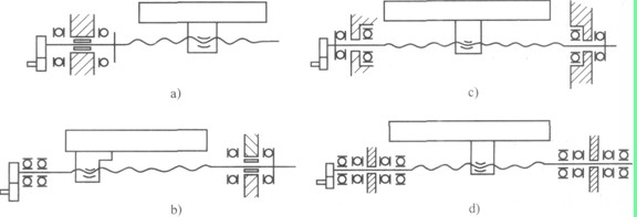 兩端裝雙重止推軸承及深溝球軸承(固定一固定式)如圖d所示。為提高剛度,絲桿兩端采用雙重支承,如止推