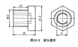 塑件工藝性分析? ??圖10-8所示堵頭零件,材料為玻璃纖維增強(qiáng)尼龍66(GFR—PA66),帶有M12的外螺紋。由于材料強(qiáng)度高和要求一模多腔,不宜采用強(qiáng)制脫螺紋或哈夫分型脫螺紋,加之塑件的錐形沉孔有一平面,可用于旋轉(zhuǎn)脫螺紋時(shí)塑件止轉(zhuǎn),所以該件適合采用旋轉(zhuǎn)方式脫螺紋。